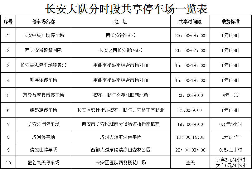 清凉山森林公园停车场,新增120个共享停车位,错时停车时间为22:00至第二天8:00,收费标准为0.5元/小时。