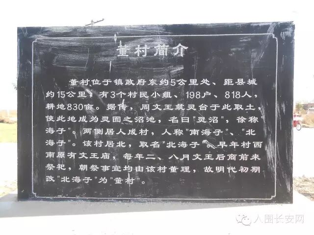 在海子村北面的村庄叫做董村,属现在户县的苍游乡管辖。据董村村碑介绍该村原名为北海子,和现在的海子村并称海子。以前在该村西南边的高土坎上,有地数顷建有周文王的宗庙祠堂,后人称其为“文王庙”。据说以前的 二、八月常有文王后裔前来举行春、秋祭祀;只因朝祭事宜均由该村董理,故明初改称“北海子”为“董村”。据葛仲卿先生介绍:以前文王庙内光有石碑就达46通,可惜文王庙毁于清末战乱。在1949年前后他还曾亲见这一片地方有许多残垣断壁、石墩石柱横竖蔽野,上面长满了一人多高的荆条和野藤,当地人称其为“乱坟岗”,让人感到荒基萧然。从建筑损毁的遗迹来看,“文王庙”以前殿堂高大,金碧辉煌、气势恢弘;至今,海子村正北的道路仍然叫做“殿前路”。可见以前“文王庙”规格之高、规模之大非同一般。这不由得使人想起古希腊高大残损的“神庙”,以及战火劫难后北京的“圆明园”。