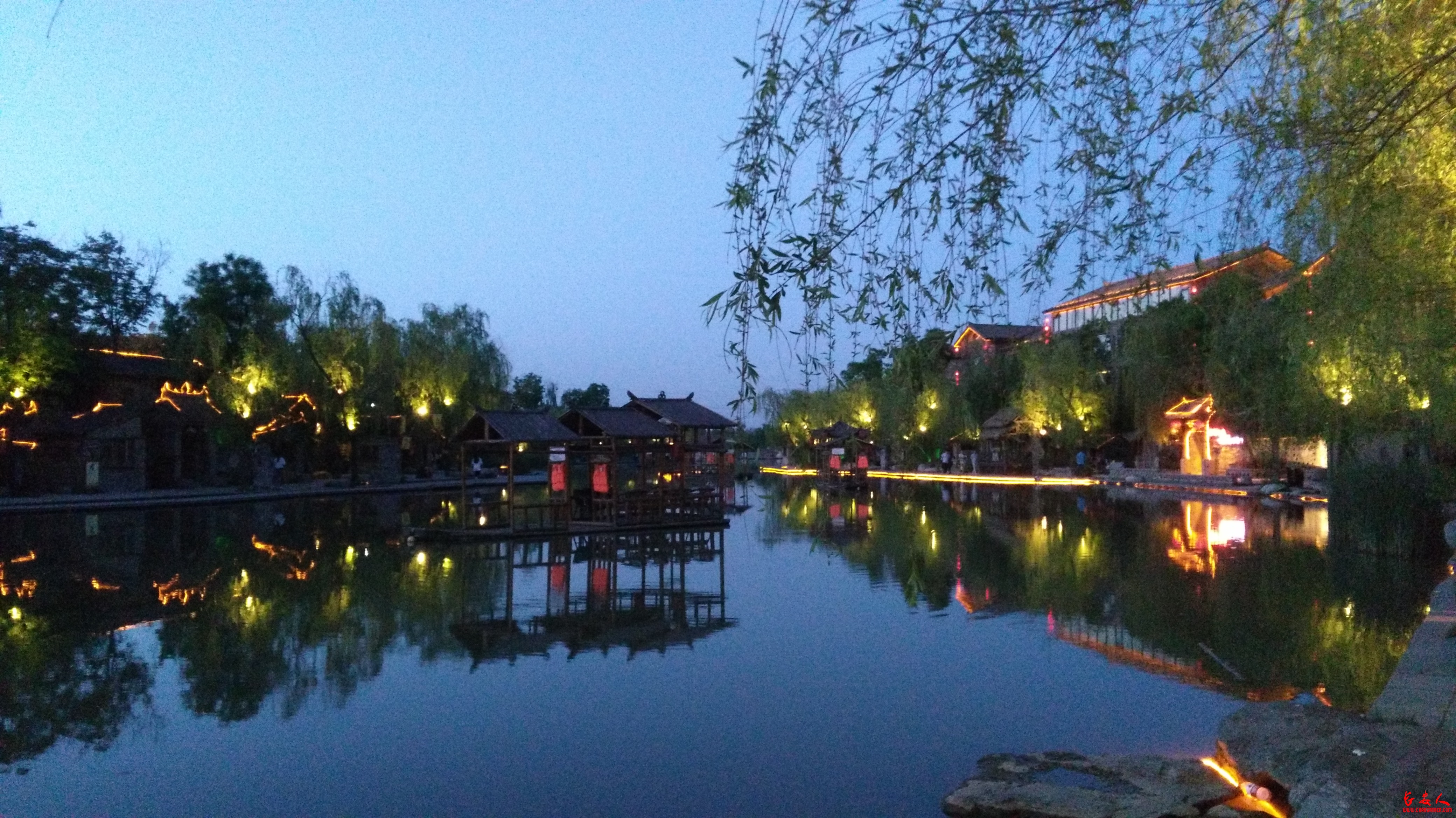108国道大桥两侧的灯火零星的亮着,拾阶而下,沙沙河的水面映入眼中。水中的绿色植物似曾见过,如芦苇一般,却不知其名。两岸垂柳轻摆,店铺满目,招牌以关中地区的建筑风格为主,略显古朴之色。石盘,石磨,石槽,石墩比比皆是。房顶多以用的是过去的小布瓦,各门店的门窗是西安周边城中村拆迁后收购而来的,但是,这并不影响水街的整体影响,更有点返璞归真了。